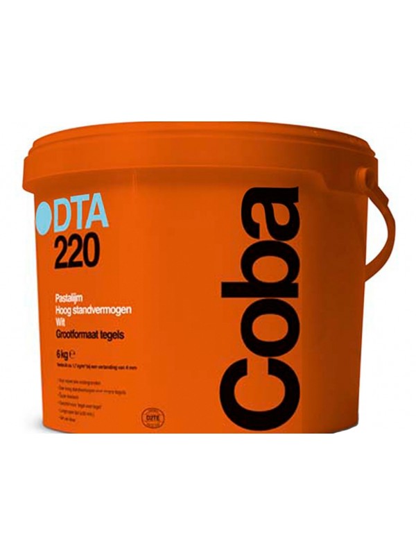 Coba pastalijm DTA220 is geschikt voor het binnenshuis verlijmen van wandtegels en mozaïek op alle gebruikelijke ondergronden, zoals beton, kalkzandsteen, cement- en gipsgebonden pleisterwerk, cellenbeton, gipsblokken, gipskarton- en gipsvezelplaten, bouw- en isolatieplaten en bestaand tegelwerk. Coba pastalijm DTA220 heeft een zeer hoog stand vermogen en is bij uitstek geschikt voor zware tegels. Coba pastalijm DTA220 is geschikt voor het verlijmen op bestaand tegelwerk (tegel over tegel) en is super elastisch. Coba pastalijm DTA220 heeft een lange open tijd en is wit van kleur. Per emmer van 16 kg