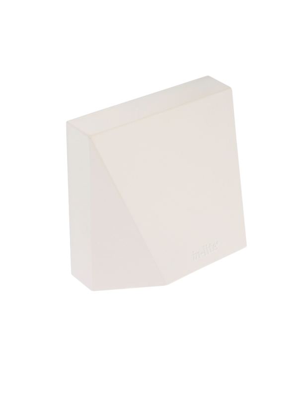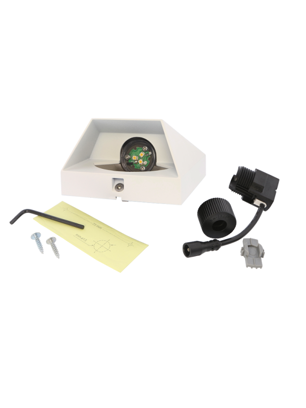 Vierkant wandarmatuur in wit gecoat aluminium. Geeft een indirect gebundeld Warm White licht. Mooi voor het verlichten van de schutting, oprit of terras. Verblindt niet.