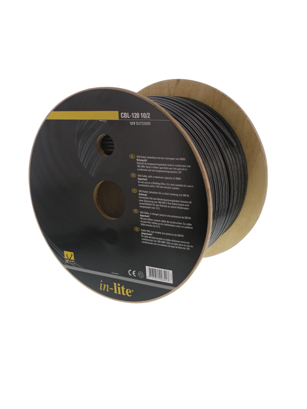 Laagspanningskabel type 10/2; 12 volt 2-aderig. Wordt geleverd als bundel van 120 meter compleet met kabelschoenen en eindisolatie. Maximale belasting 250 watt, maximale kabellengte (lineair gelegd) 80 meter.