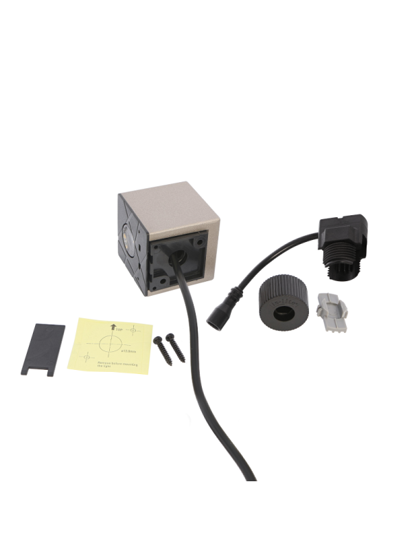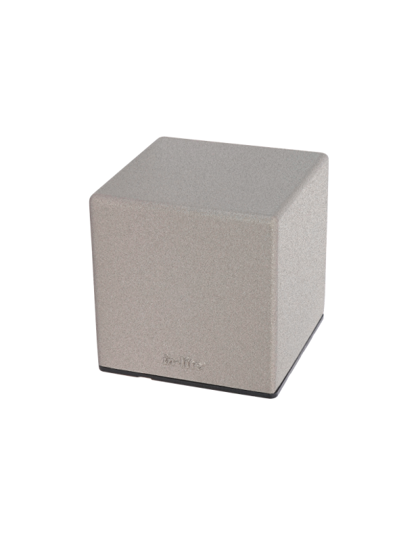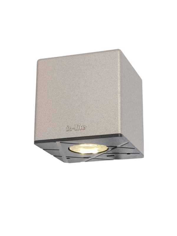 Subtiel kubusvormig wandarmatuur in warm zilver gecoat aluminium. Geeft een warm wit licht. CUBID is geschikt voor het verlichten van bijvoorbeeld vijverranden en pergola's.