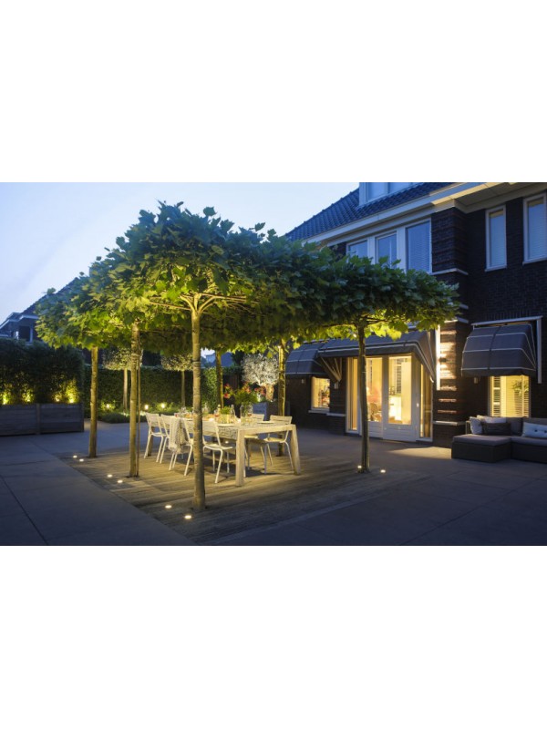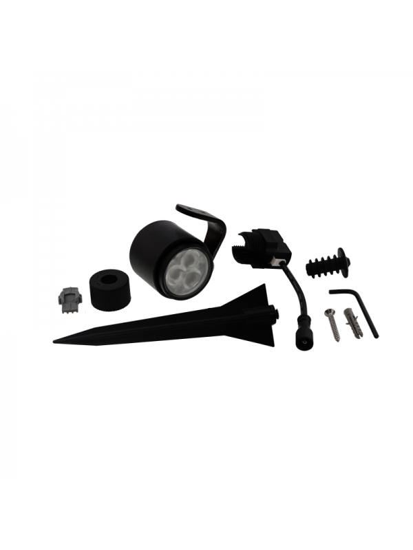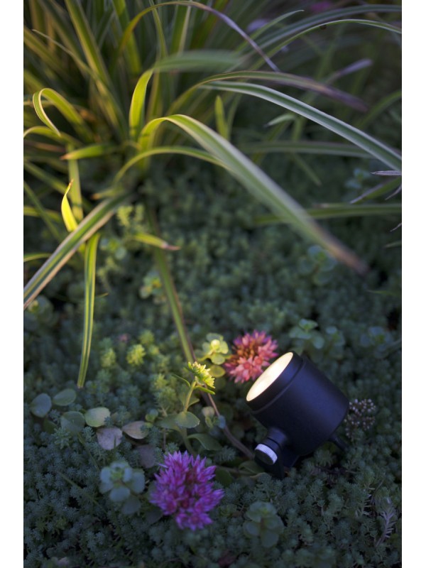 Deze kleine spot wordt standaard geleverd met een beugel en grondpen. Dit maakt het armatuur geschikt voor montage aan bijvoorbeeld een schutting of in een overkapping en voor het aanlichten van planten en struiken in de border. Zie de video bij het kopje Verwerkingsadvies en Downloads. Dit is de uitvoering met de zwarte ring en beugel.